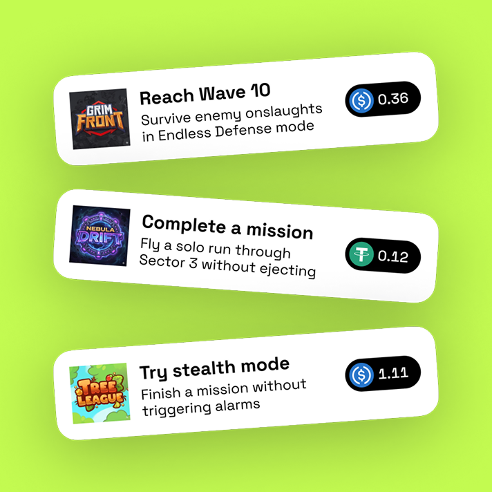 Launch stablecoin-powered quests and rewards without blockchain complexity — increasing acquisition efficiency, revenue, and player engagement.